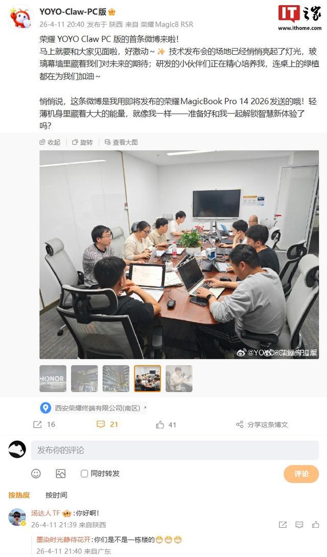 据该账号介绍,荣耀 YOYO Claw PC 版的首条微博由即将发布的荣耀 MagicBook Pro 14 2026 笔记本发送。这意味着荣耀 YOYO Claw PC 版“龙虾”将至,同时还有望随新笔记本一起亮相发布会。